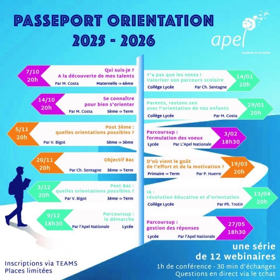 En visioconférenceVotre enfant se prépare à formuler ses vœux sur la plateforme nationale Parcoursup, permettant de candidater à l’entrée dans l’Enseignement supérieur ? Afin de l’accompagner au mieux dans cette étape importante, rejoignez le webinaire Accompagner la formulation des voeux sur Parcoursup, organisé par l’Apel nationale. Présenté par Mme Laure COQUELET, membre du bureau national de l’Apel et animé par M. Jérôme TEILLARD, chef de projet Parcoursup au ministère de l’Enseignement supérieur, ce webinaire vous permettra de connaître et comprendre les principes clés de la formulation des vœux sur Parcoursup, de bénéficier de conseils pratiques et de découvrir les nouveautés 2025 proposées [...]